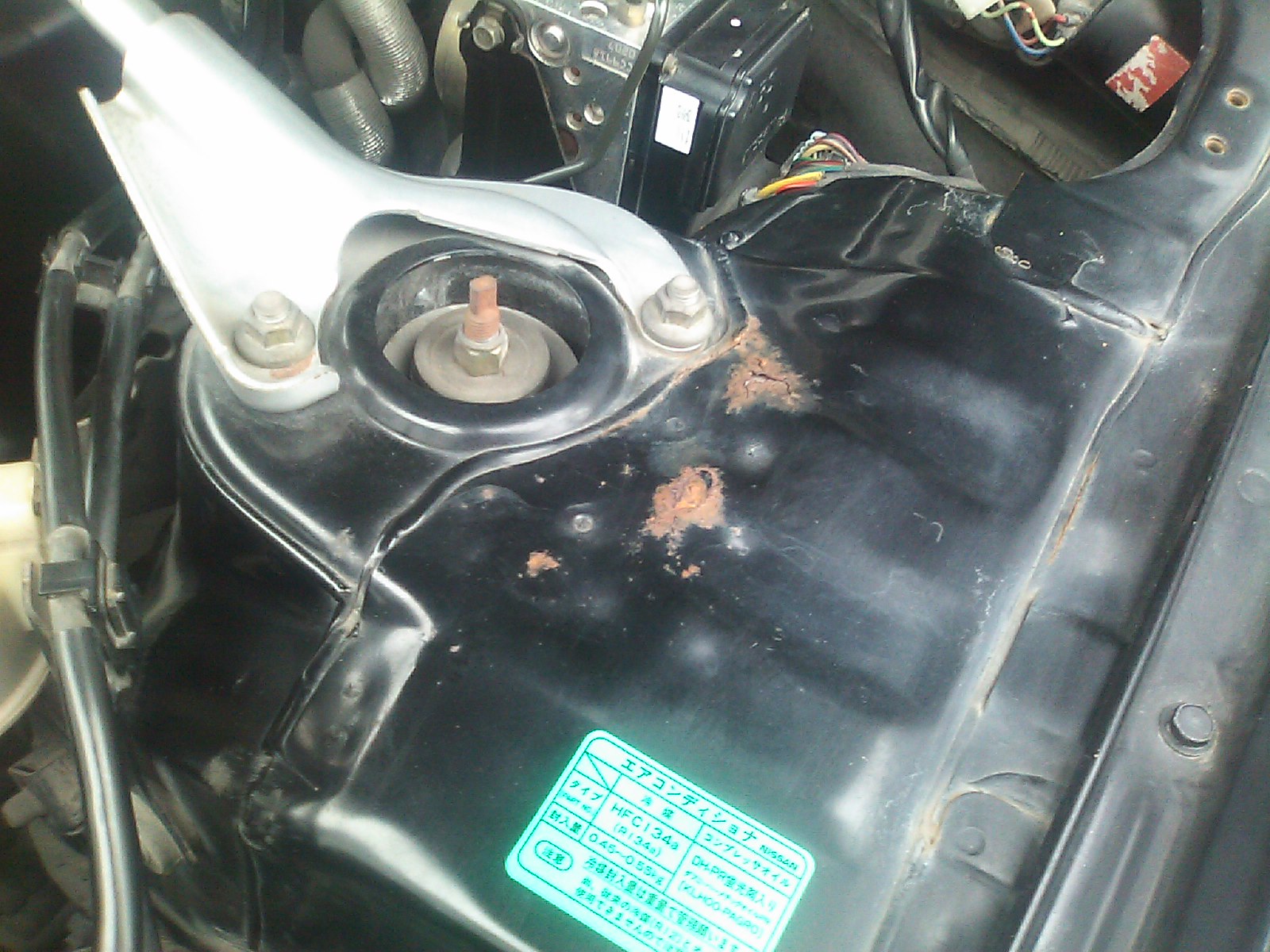 R34を中古で買う場合の重大チェックポイントのひとつであるストラットの錆、この画像はまだ全然マシなほうです。「r34 ストラット 錆」でgoogle画像検索するともっとすごいのがたくさん出てきます。